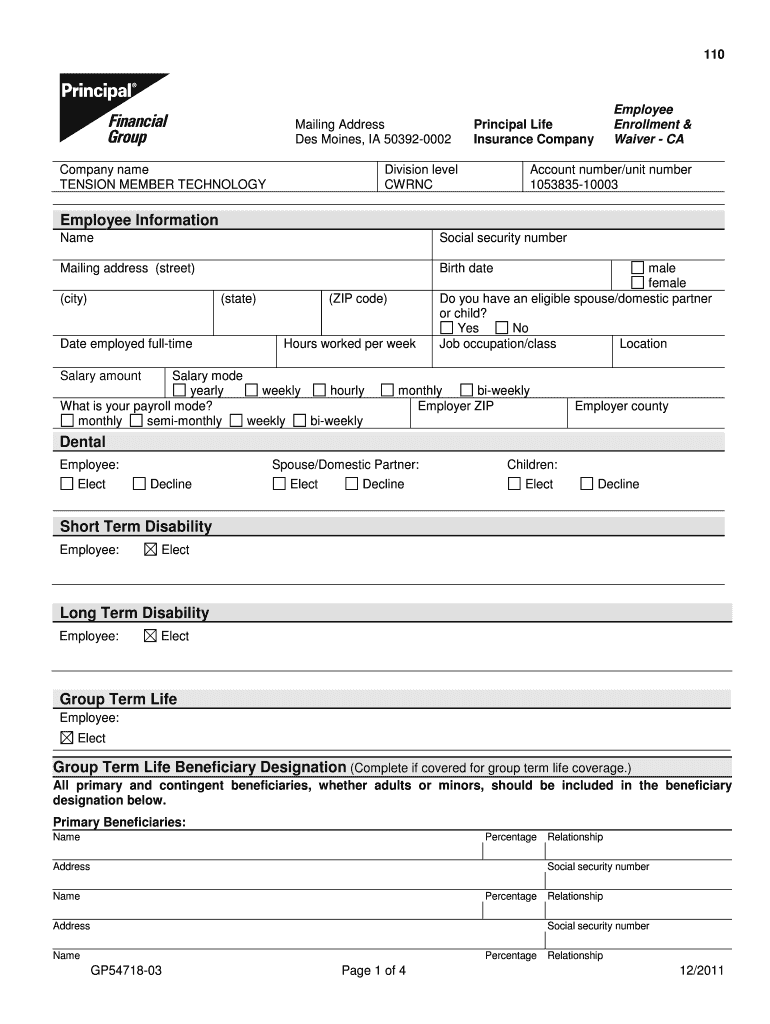 110Mailing Address Des Moines, IA 503920002 Company name TENSION MEMBER TECHNOLOGYEmployee Enrollment & Waiver Principal Life Insurance CompanyDivision level CWRNCAccount number/unit number 105383510003Employee
