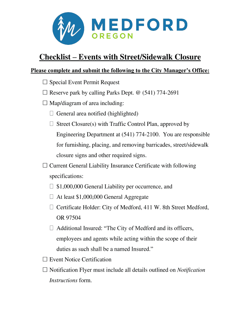 Checklist Events with Street/Sidewalk Closure Please complete and submit the following to the City Managers Office: Special Event Permit Request Reserve park by calling Parks Dept. (541) 7742691 Map/diagram