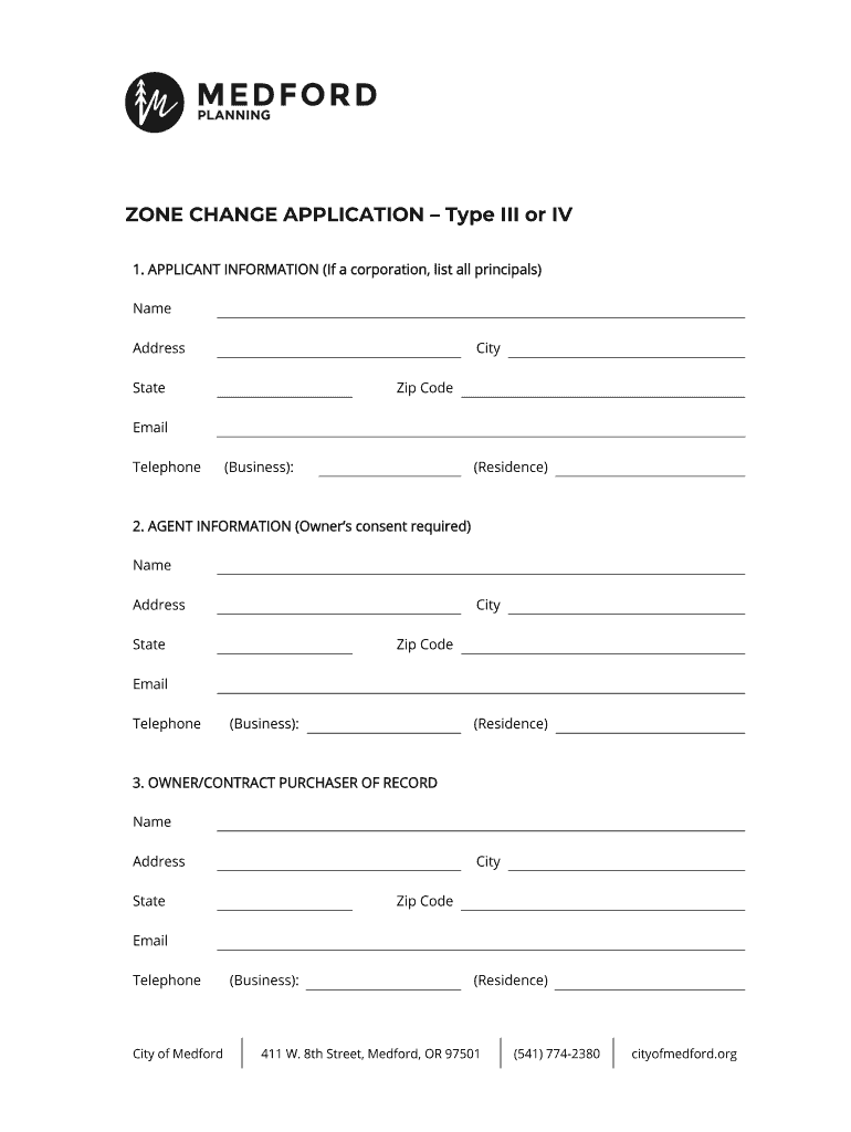 ZONE CHANGE APPLICATION Type III or IV 1. APPLICANT INFORMATION (If a corporation, list all principals) Name AddressCityStateZip Voicemail Telephone(Business):(Residence)2. AGENT INFORMATION (Owners
