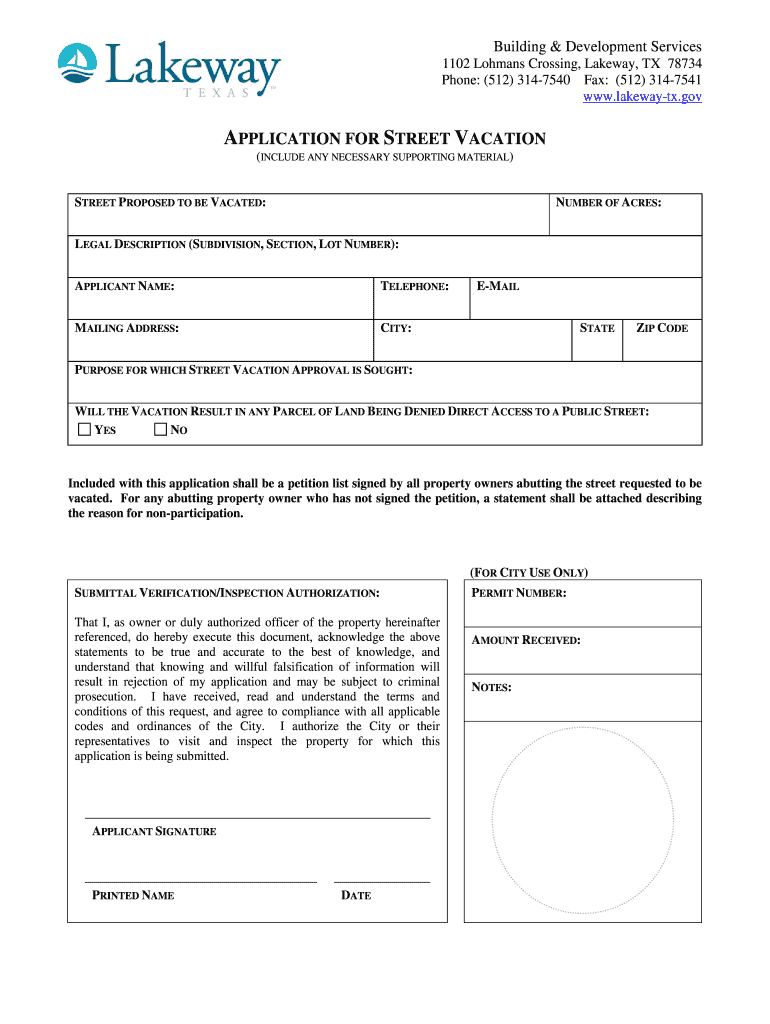 Building & Development Services 1102 Loans Crossing, Lake way, TX 78734 Phone: (512) 3147540 Fax: (512) 3147541 www.lakewaytx.govAPPLICATION FOR STREET VACATION (INCLUDE ANY NECESSARY SUPPORTING MATERIAL)STREET
