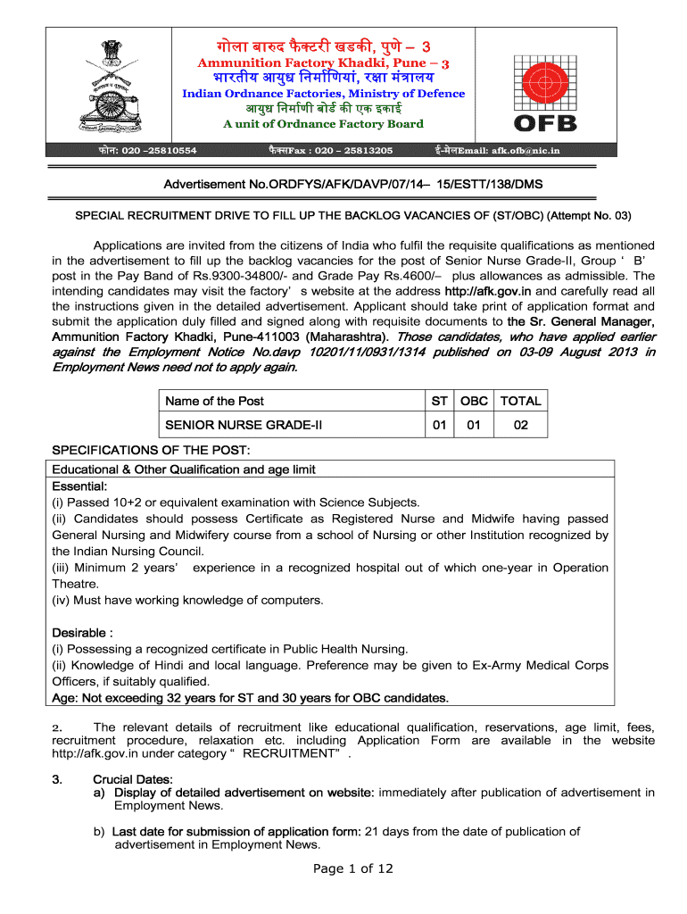 , 3 Ammunition Factory Khaki, Pune 3, Indian Ordnance Factories, Ministry of Defense A unit of Ordnance Factory Board : 020 25810554 Fax : 020 25813205Email: AFK.of NIC.advertisement No.ORDFYS/AFK/DAVP/07/14