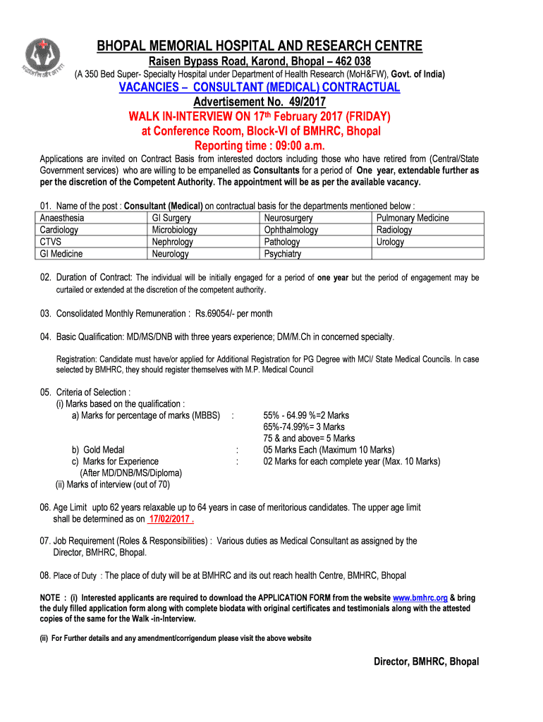BHOPAL MEMORIAL HOSPITAL AND RESEARCH Center Raised Bypass Road, Around, Bhopal 462 038 (A 350 Bed Super Specialty Hospital under Department of Health Research (Moscow), Govt. of India)VACANCIES CONSULTANT