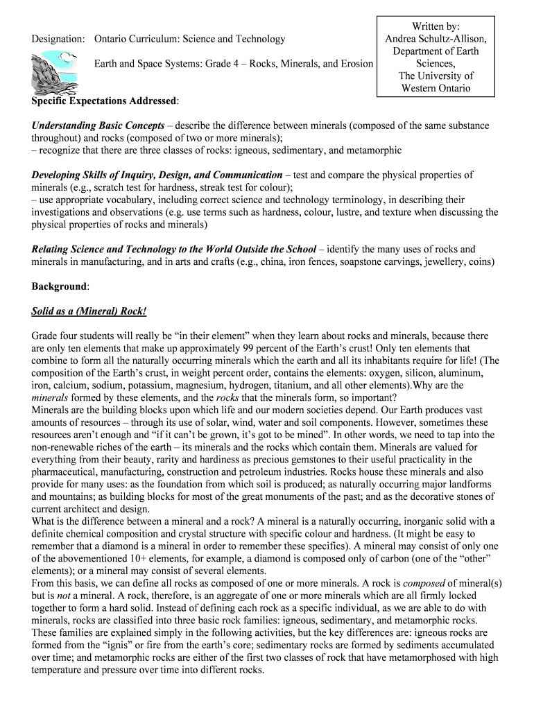 Key Features of the Ontario Grade 4 Science Rocks and Minerals Worksheet