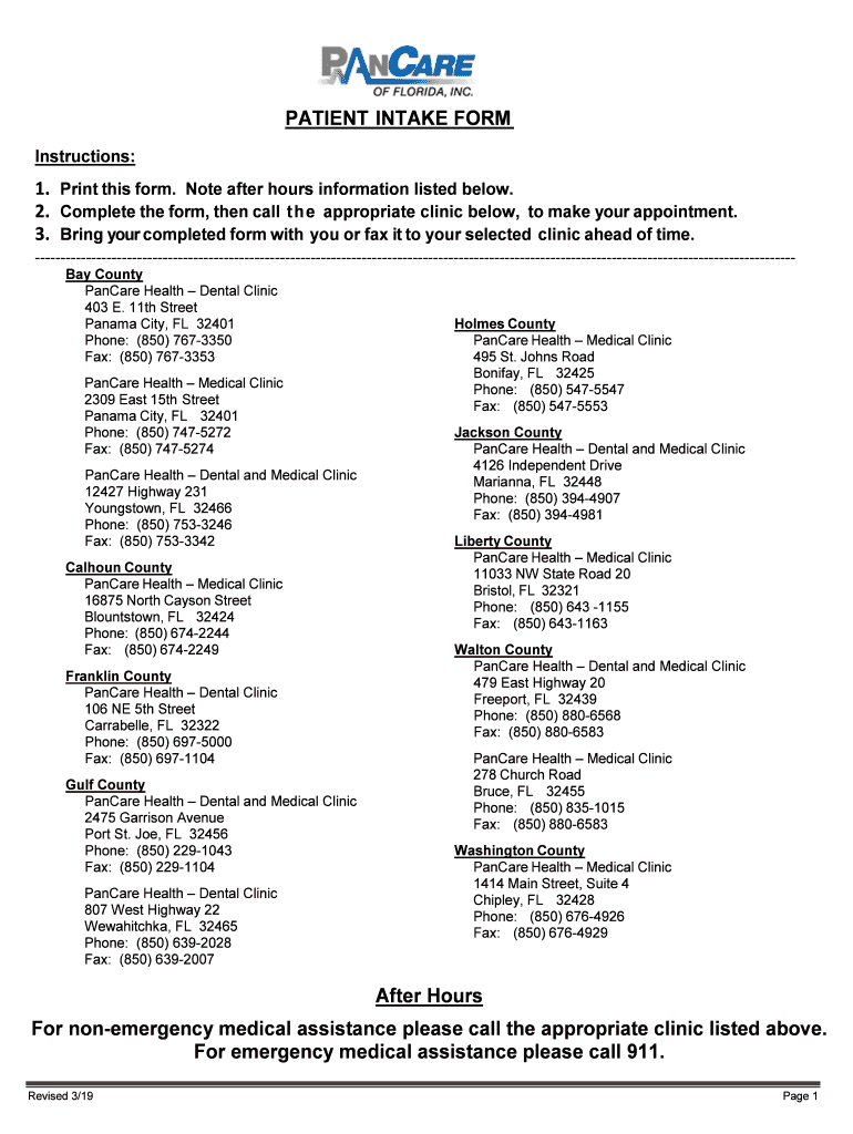 PATIENT INTAKE FORM Instructions:1. Print this form. Note after hours information listed below. 2. Complete the form, then call t h e appropriate clinic below, to make your appointment. 3. Bring your