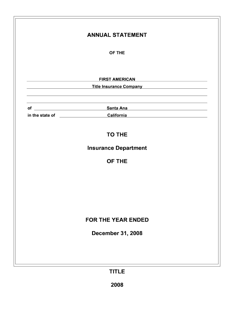 ANNUAL STATEMENT OF THEIRS AMERICAN Title Insurance CompanyofSanta Again the state ofCaliforniaTO THE Insurance Department OF They're THE YEAR ENDED December 31, 2008TITLE INSURANCE COMPANIES ASSOCIATION