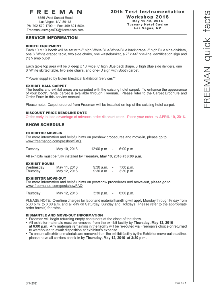 6555 West Sunset Road Las Vegas, NV 89118 pH: 7025791700 Fax: 4696215604 FreemanLasVegasES freeman co. Comma 1012, 2016 Tuscany Hotel Casino Las Vegas, SERVICE INFORMATION BOOTH EQUIPMENTEach 10 ×