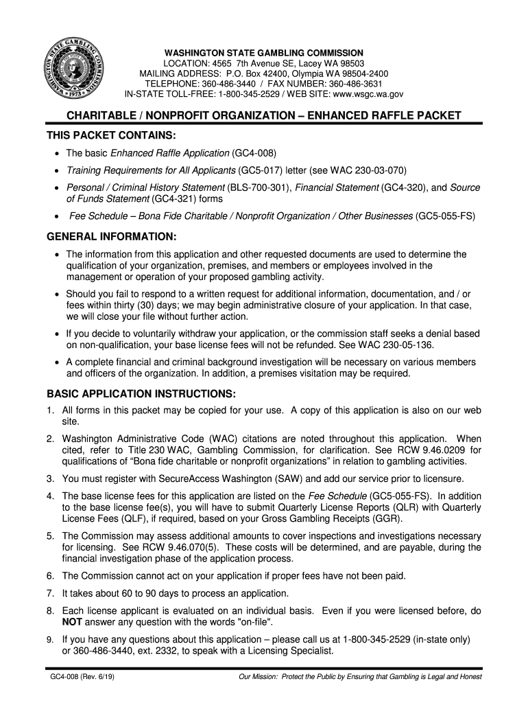 WASHINGTON STATE GAMBLING COMMISSION LOCATION: 4565 7th Avenue SE, Lacey WA 98503 MAILING ADDRESS: P.O. Box 42400, Olympia WA 985042400 TELEPHONE: 3604863440 / FAX NUMBER: 3604863631 INSTATE TOLL-FREE: