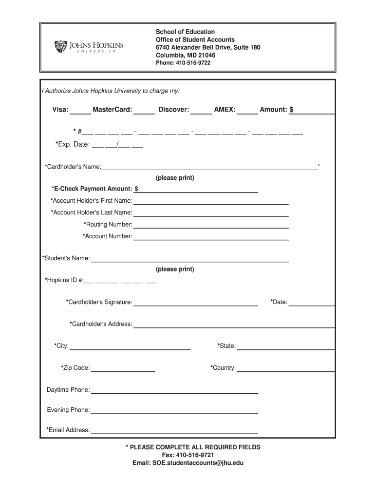 School of Education Office of Student Accounts 6740 Alexander Bell Drive, Suite 180 Columbia, MD 21046 Phone: 4105169722I Authorize Johns Hopkins University to charge my:Visa:MasterCard:Discover:AMEX:Amount: