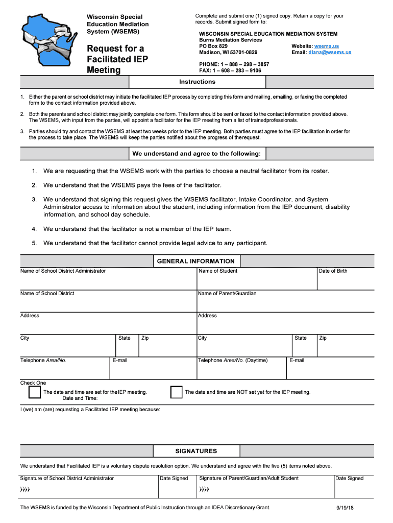 Complete and submit one (1) signed copy. Retain a copy for your records. Submit signed form to:Wisconsin Special Education Mediation System (WS EMS)WISCONSIN SPECIAL EDUCATION MEDIATION SYSTEM Burns