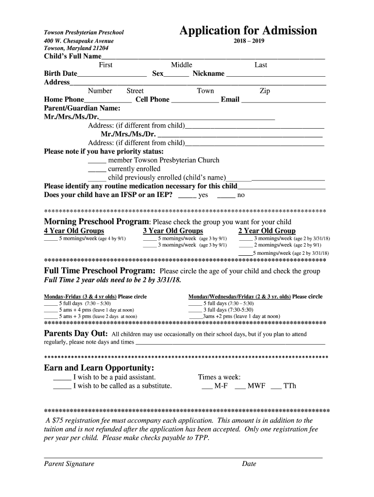 Get the free Towson Presbyterian Preschool Application for Admission 2018 2019