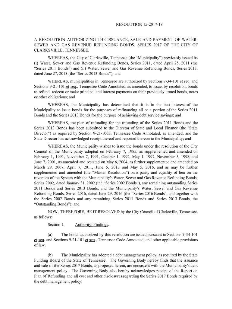 SEWER AND GAS REVENUE REFUNDING BONDS, SERIES 2017 OF THE CITY OF
