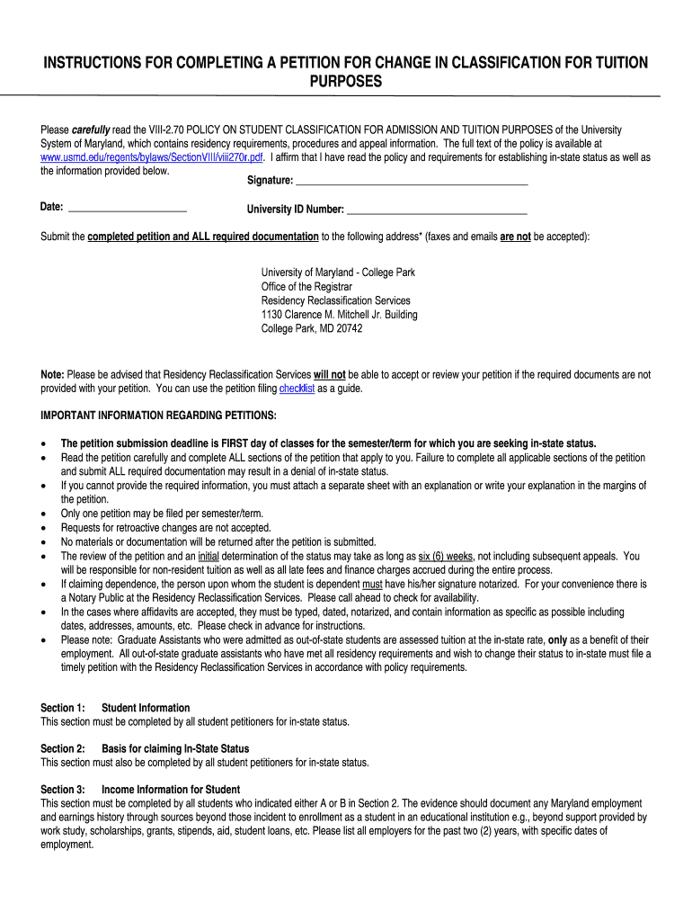 INSTRUCTIONS FOR COMPLETING A PETITION FOR CHANGE IN CLASSIFICATION FOR TUITION