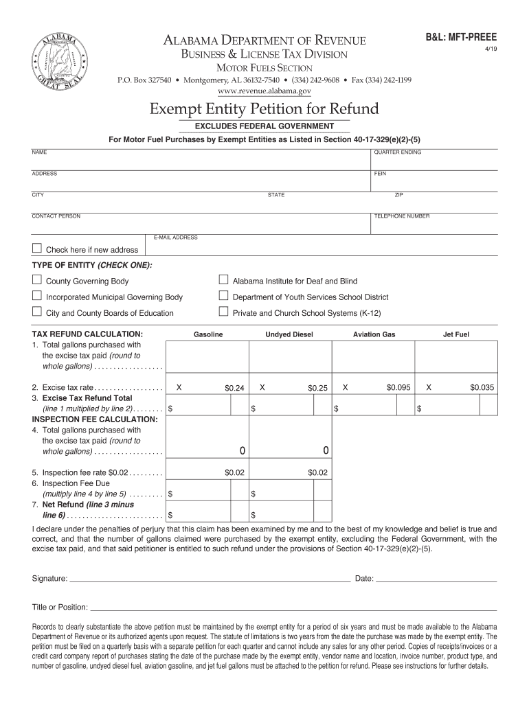 RESEMBLE: MFTPREEEAlAbAmA Department of revenue4/19business & license tax Division motor fuels section p.o. box 327540montgomery, Al 361327540(334) 2429608fax (334) 2421199 www.revenue.alabama.govexempt