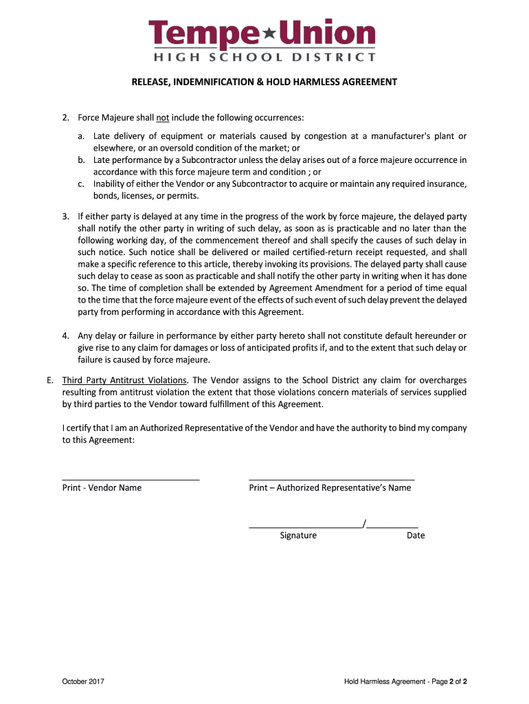RELEASE, INDEMNIFICATION & HOLD HARMLESS AGREEMENT The Vendor agrees, by accepting award of this bid, agreement, project, service and/or maintenance agreement to the following Release, Indemnification