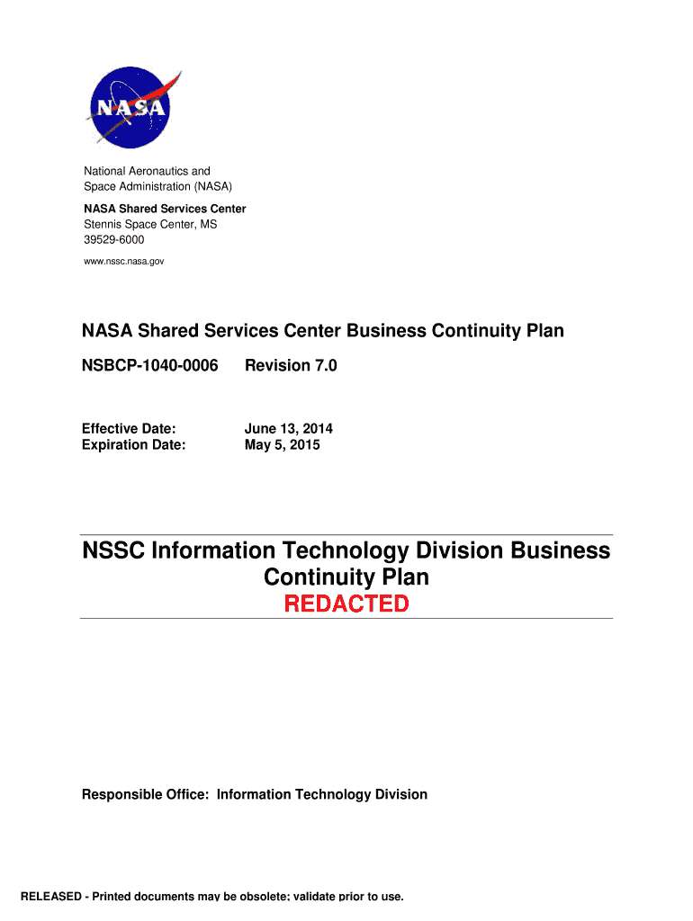 National Aeronautics and Space Administration (NASA) NASA Shared Services Center Tennis Space Center, MS 395296000 www.nssc.nasa.govNASA Shared Services Center Business Continuity Plan NSBCP10400006Revision