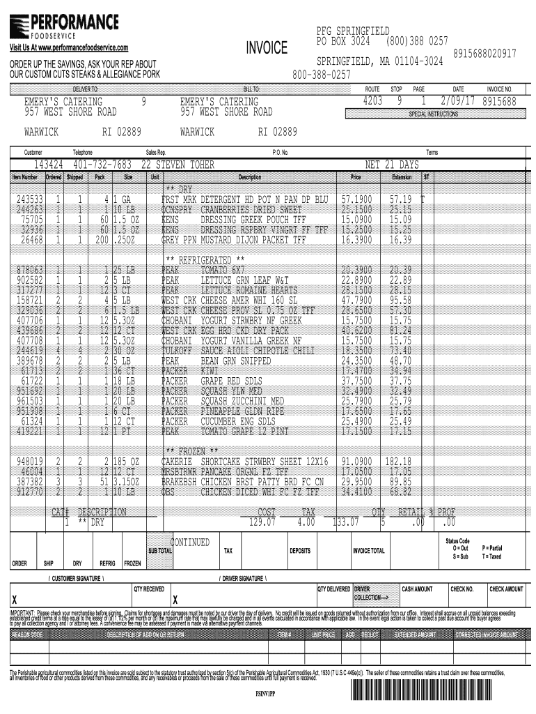 PIG SPRINGFIELD PO BOX 3024 (800)388 0257 8915688020917 SPRINGFIELD, MA 011043024 8003880257INVOICEVisit Us At www.performancefoodservice.comORDER UP THE SAVINGS, ASK YOUR REP ABOUT OUR CUSTOM CUTS
