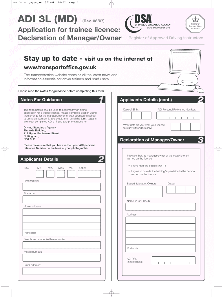 ADI 3L MD pages AH5/2/0814:07Page 1ADI 3L (MD)(Rev. 08/07)Application for trainee license: Declaration of Manager/OwnerRegister of Approved Driving InstructorsStay up to date visit us on the internet