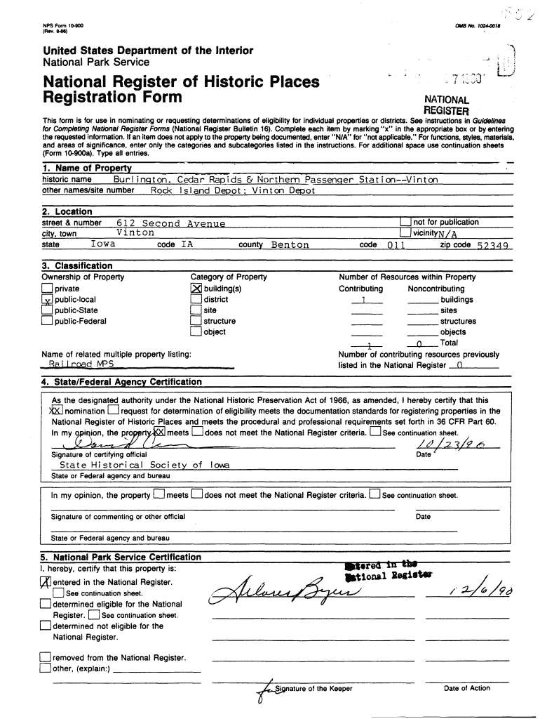 NPS Form 10900 (RV. 846)RMS No. 10244018nUnited States Department of the Interior National Park ServiceNational Register of Historic Places Registration Formation Registers form is for use in nominating