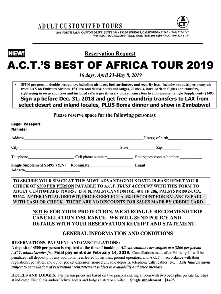 Get the free NEW! Reservation Request A.C.T.S BEST OF AFRICA TOUR 2019