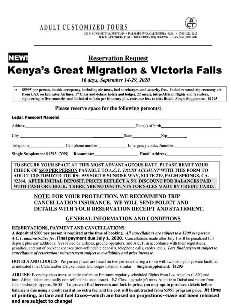 NEW! Reservation RequestKenyas Great Migration & Victoria Falls 16 days, September 1429, 2020 ×5995 per person, double occupancy, including air taxes, fuel surcharges, and security fees. Includes