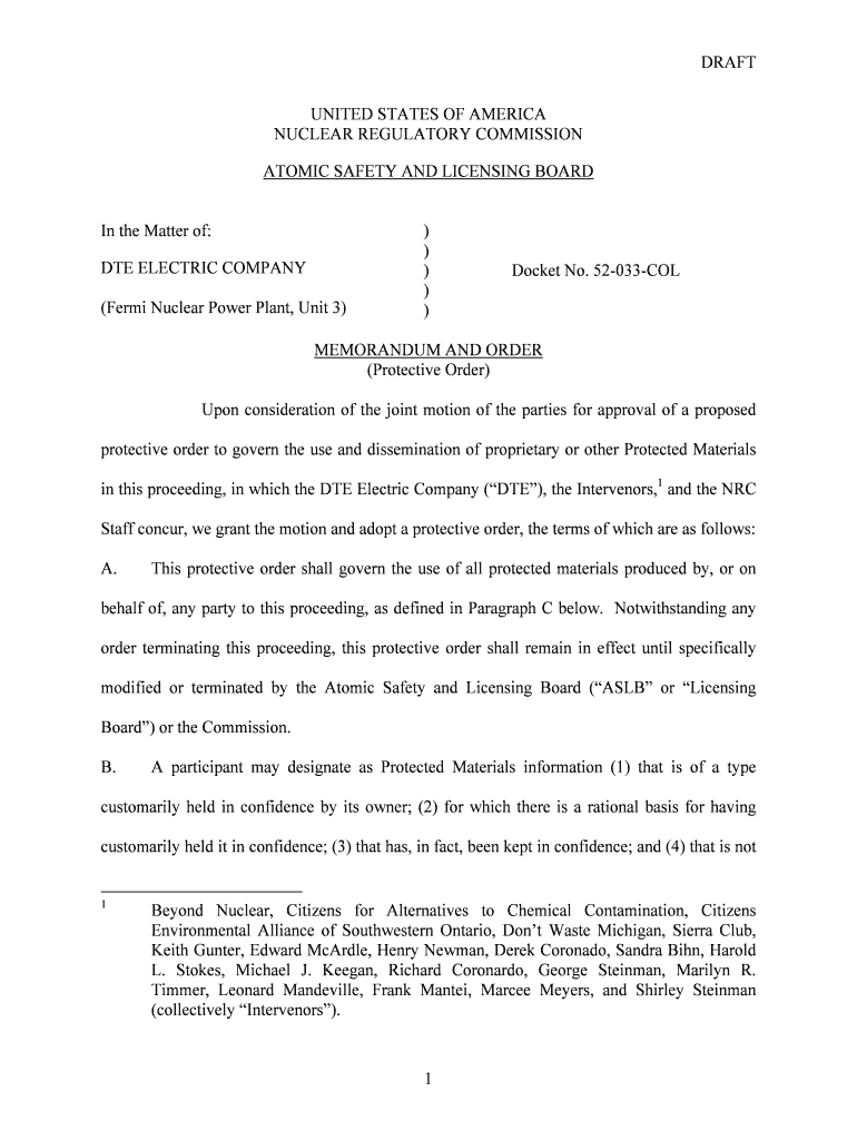 (Fermi Nuclear Power Plant, Unit 3))))))Docket No. 52033COLMEMORANDUM