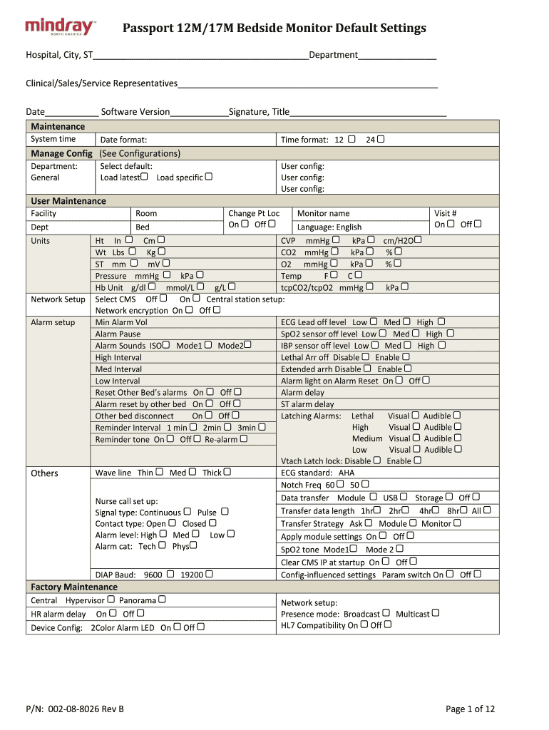 Passport 12M/17M Bedside Monitor Default Settings Hospital, City, ST Department Clinical/Sales/Service Representatives Date Software Version Signature, Title Maintenance System immediate format:Time