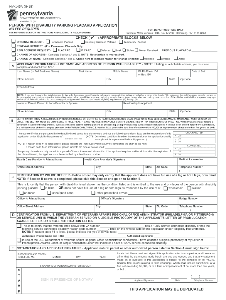 MV145A(818)PERSON WITH DISABILITY PARKING PLACARD APPLICATION www.dmv.pa.govNO FEE REQUIRED REVERSE SIDE FOR INSTRUCTIONS AND ELIGIBILITY REQUIREMENTSChECK (4FOR DEPARTMENT USE ONLY Bureau of Motor