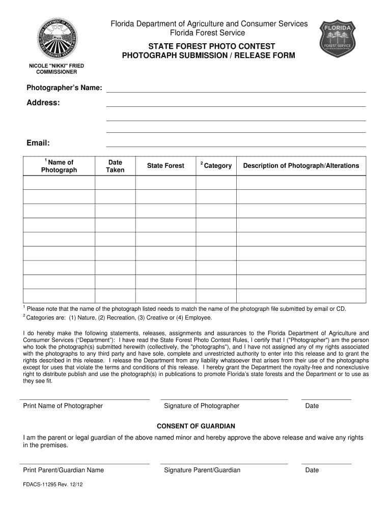 Florida Department of Agriculture and Consumer Services Florida Forest Service STATE FOREST PHOTO CONTEST PHOTOGRAPH SUBMISSION / RELEASE FORM NICOLE “NIKKI FRIED COMMISSIONERPhotographers Name:Address:Email:
