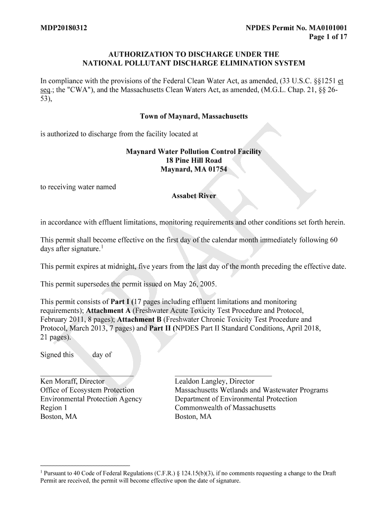 MDP20180312NPDES Permit No. MA0101001 Page 1 of 17AUTHORIZATION TO DISCHARGE UNDER THE NATIONAL POLLUTANT DISCHARGE ELIMINATION SYSTEM In compliance with the provisions of the Federal Clean Water