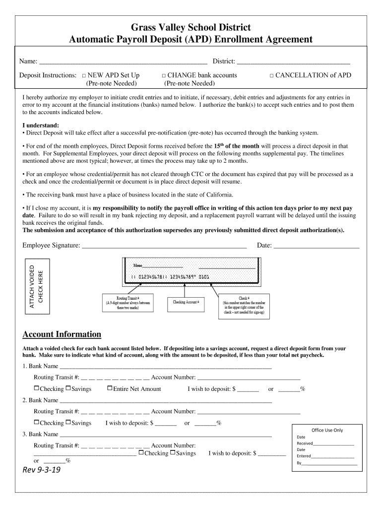 Grass Valley School District Automatic Payroll Deposit (APD) Enrollment Agreement Name: District: Deposit Instructions: NEW APD Set Up (Promote Needed) CHANGE bank accounts (Promote Needed) CANCELLATION