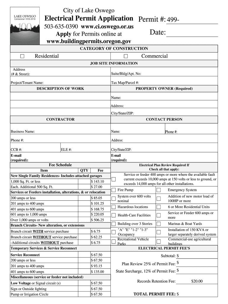 City of Lake OswegoElectrical Permit Application Permit #: 4995036350390 www.ci.oswego.or.us Apply for Permits online at www.buildingpermits.oregon.govDate:CATEGORY OF CONSTRUCTIONResidentialCommercial