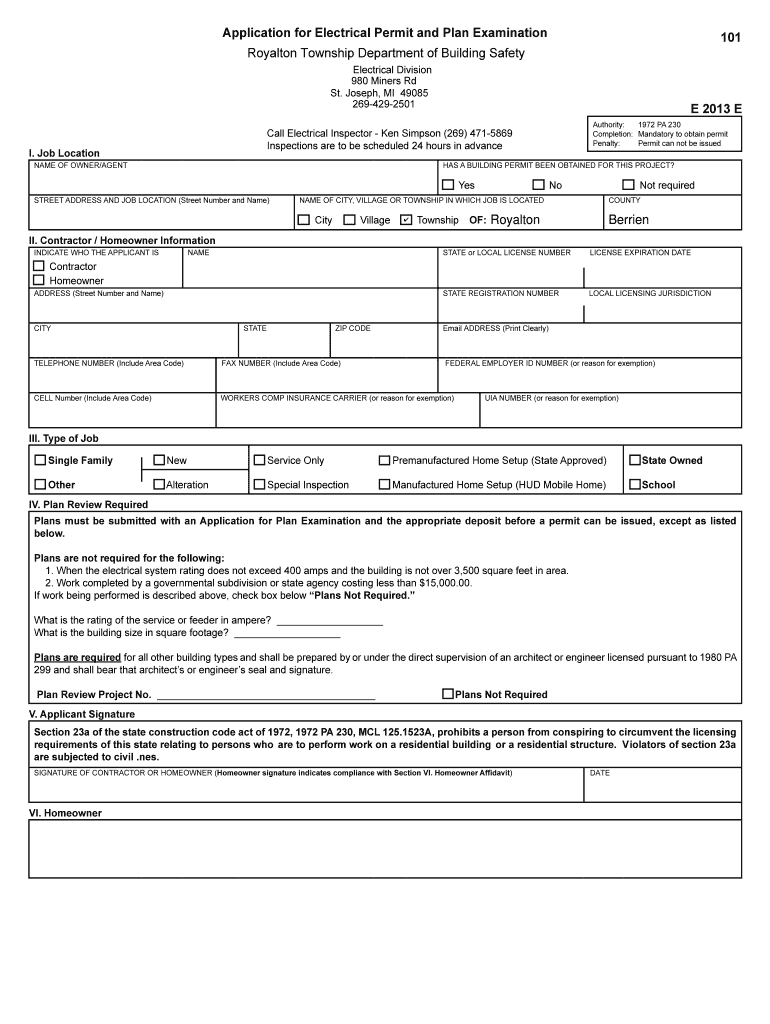 Application for Electrical Permit and Plan Examination101Royalton Township Department of Building SafetyPrintElectrical Division 980 Miners Rd St. Joseph, MI 49085 2694292501 This form can be completed
