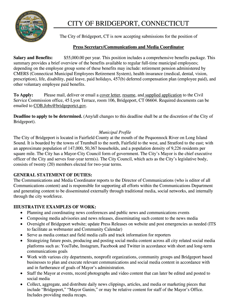 The City of Bridgeport, CT is now accepting submissions for the position of