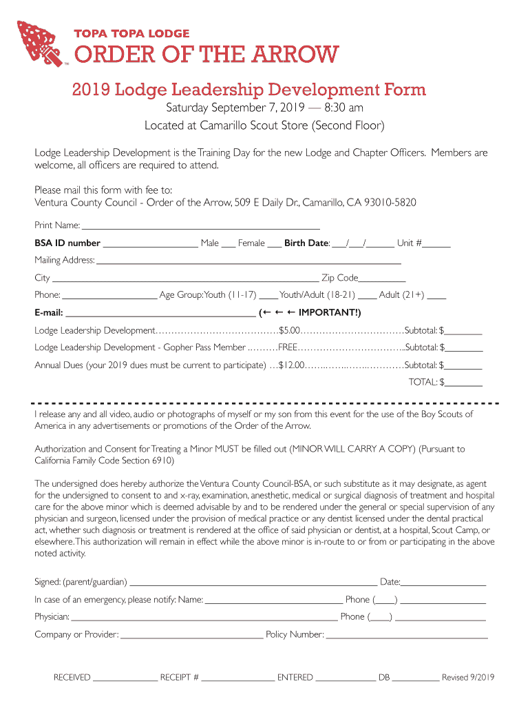 TOP LODGEORDER OF THE ARROW 2019 Lodge Leadership Development Form Saturday, September 7, 2019 8:30 am Located at Camarillo Scout Store (Second Floor)Lodge Leadership Development is the Training Day