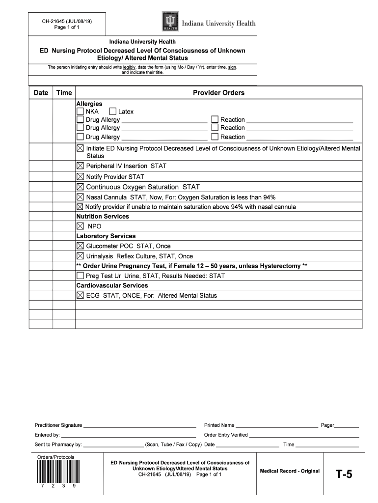 CH21645 (JUL/08/19) Page 1 of 1Indiana University Health Nursing Protocol Decreased Level Of Consciousness of Unknown Etiology/ Altered Mental Status The person initiating entry should write legibly,