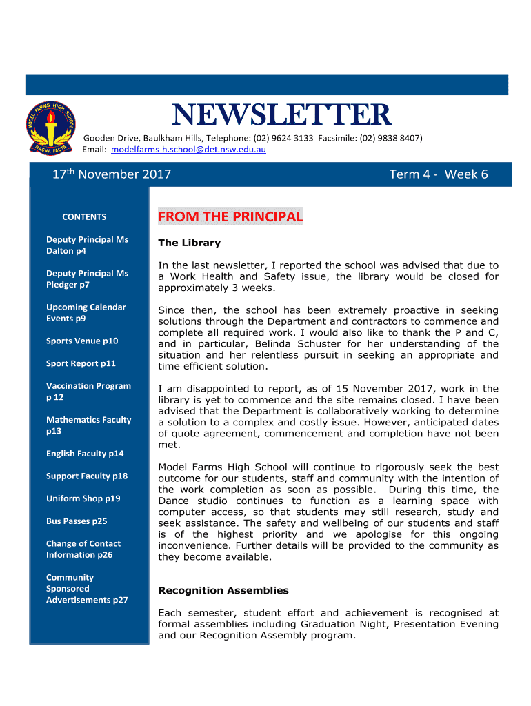 NEWSLETTER Wooden Drive, Balkan Hills, Telephone: (02) 9624 3133 Facsimiles: (02) 9838 8407) Email: modelfarmsh. School DET.NSW.edu.au17th November 2017 CONTENTSTerm 4 Week 6FROM THE PRINCIPALDeputy