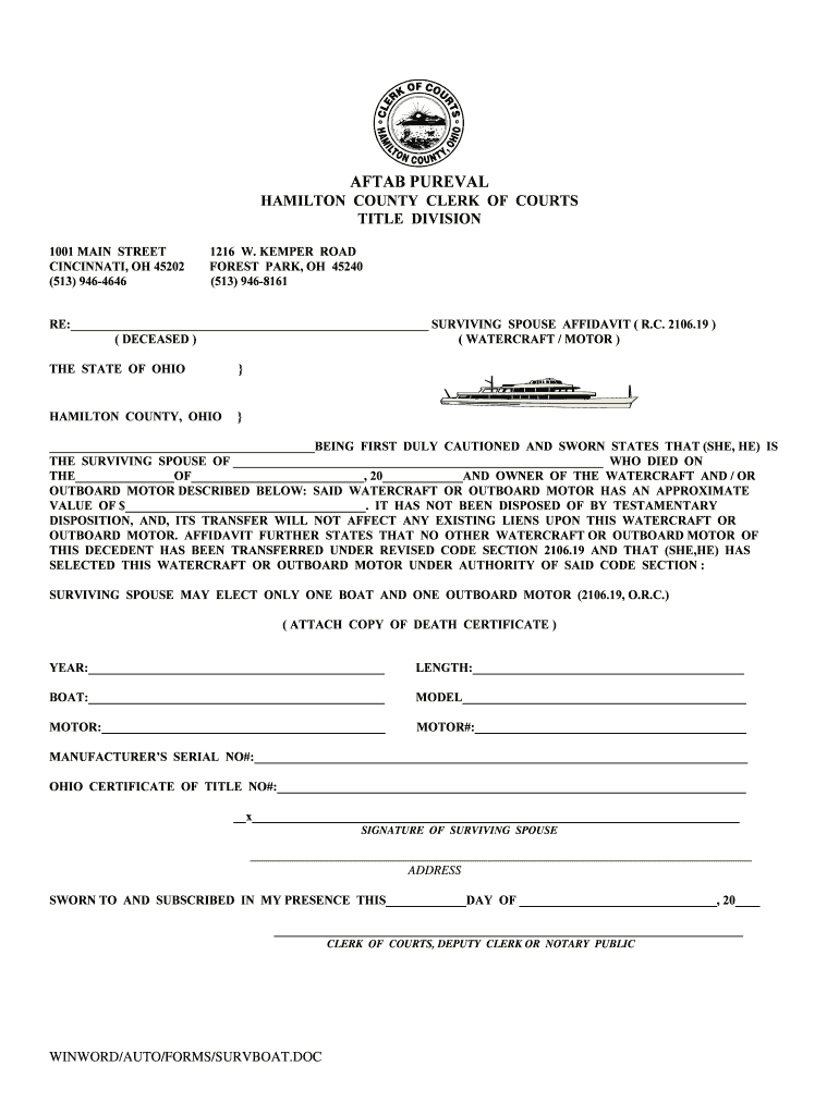 AFT AB PUREVALHAMILTON COUNTY CLERK OF COURTS TITLE DIVISION 1001 MAIN STREET CINCINNATI, OH 45202 (513) 94646461216 W. KEEPER ROAD FOREST PARK, OH 45240 (513) 9468161RE: SURVIVING SPOUSE AFFIDAVIT