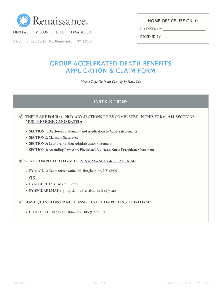 HOME OFFICE USE ONLY: RELEASED BY: RECEIVED BY:2 Court Street, Suite 102, Binghamton, NY 13901GROUP ACCELERATED DEATH BENEFITS APPLICATION & CLAIM FORM Please Type Or Print Clearly In Dark Instructions