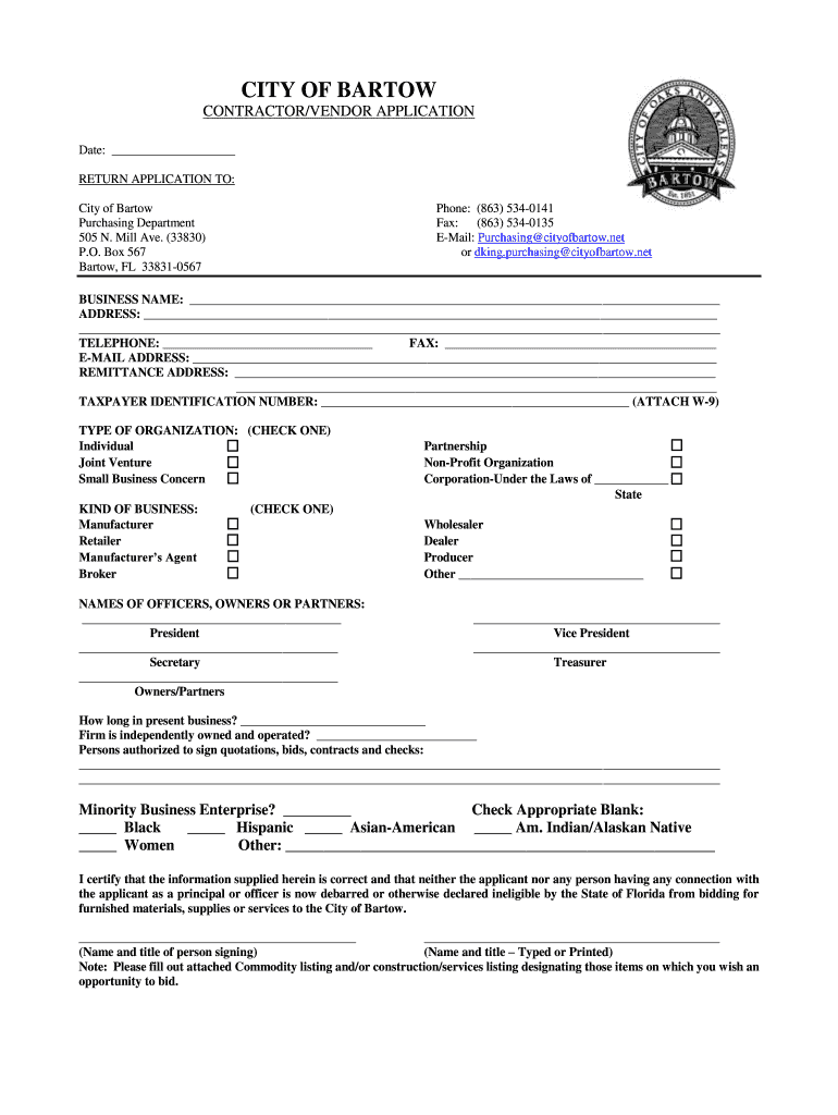 CITY OF BARTON CONTRACTOR/VENDOR APPLICATION Date: RETURN APPLICATION TO: City of Barton Purchasing Department 505 N. Mill Ave. (33830) P.O. Box 567 Barton, FL 338310567Phone: (863) 5340141 Fax: (863)