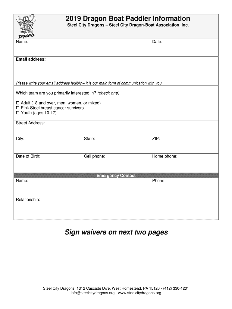 2019 Dragon Boat Paddler Information Steel City Dragons Steel City Dragonball Association, Inc. Name:Date:Email address:Please write your email address legibly it is our main form of communication