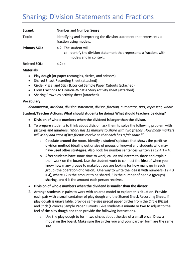 Sharing: Division Statements and Fractions Strand:Number and Number SenseTopic:Identifying and interpreting the division statement that represents a fraction using models. Primary SOL:4.2 The student