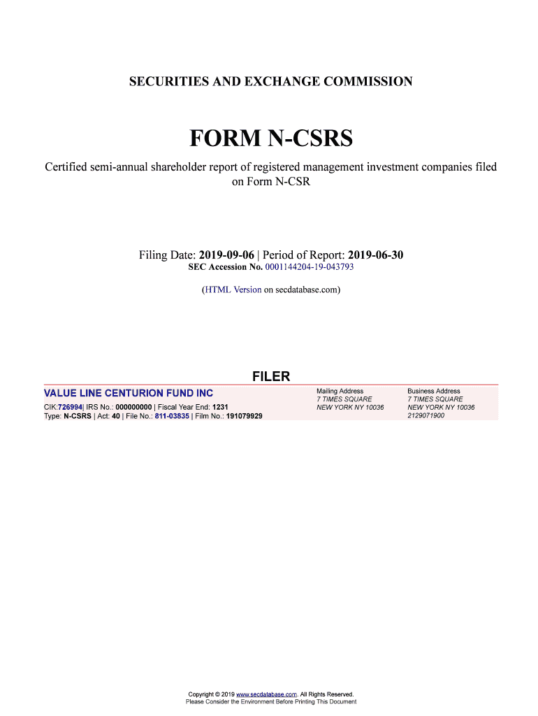 Get the free VALUE LINE CENTURION FUND INC Form N-CSRS Filed 2019-09-06. Accession Number