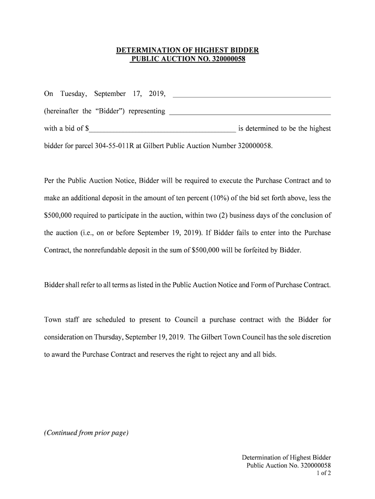 DETERMINATION OF HIGHEST BIDDER PUBLIC AUCTION NO. 320000058On Tuesday, September 17, 2019, (hereinafter the Bidder) representing with a bid of $ is determined to be the highest bidder for parcel