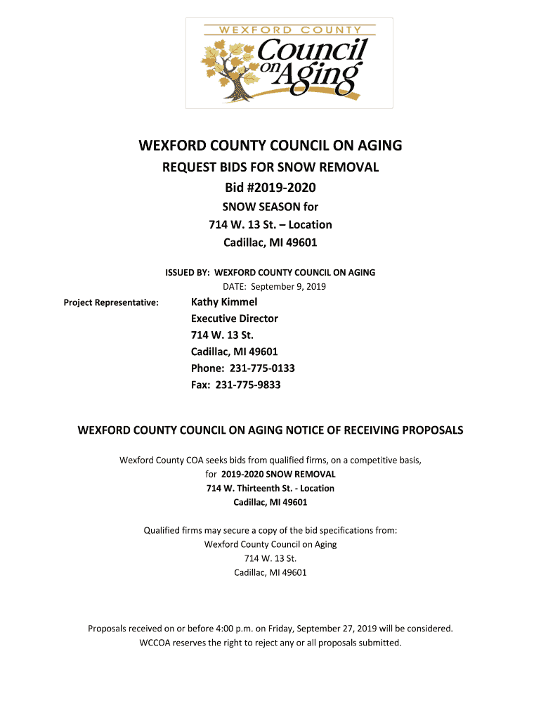OXFORD COUNTY COUNCIL ON AGING REQUEST BIDS FOR SNOW REMOVAL Bid #20192020 SNOW Seasons for 714 W. 13 St. Location Cadillac, MI 49601 ISSUED BY: OXFORD COUNTY COUNCIL ON AGING DATE: September 9, 2019,