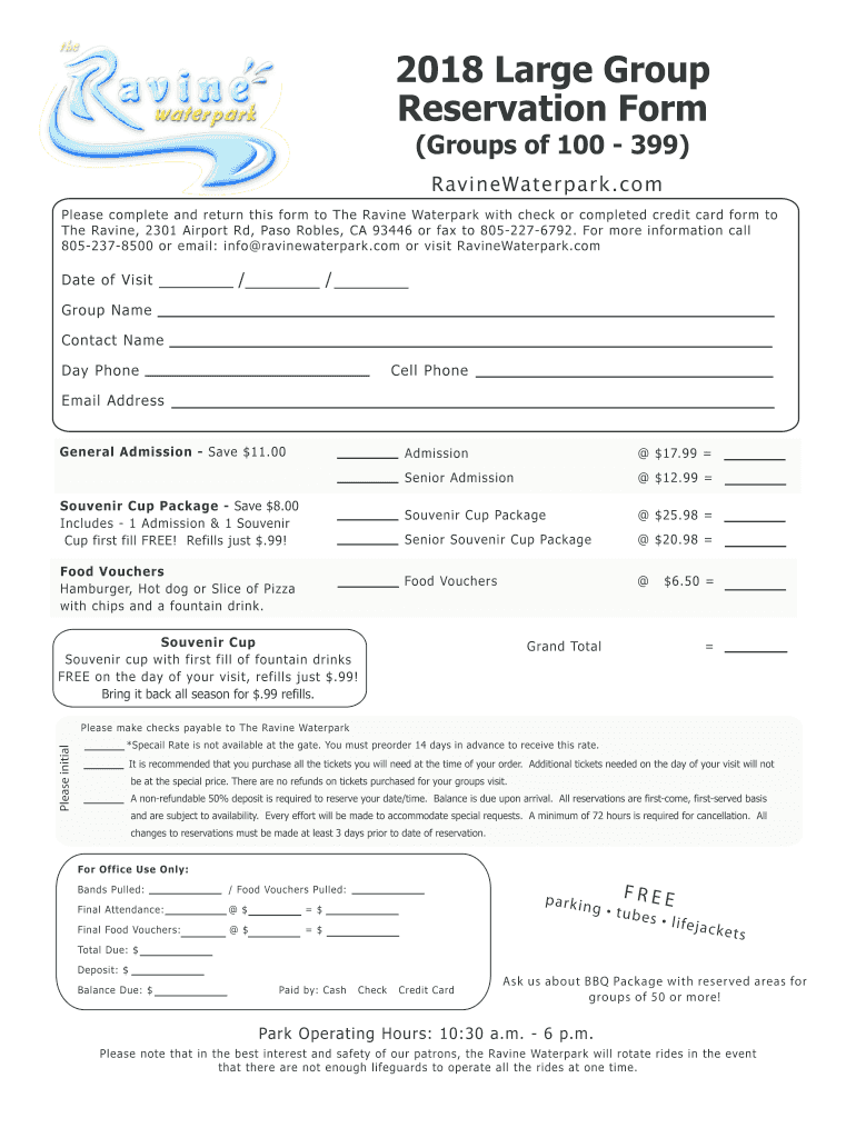 2018 Large Group Reservation Form (Groups of 100 399) RavineWaterpark.com Please complete and return this form to The Ravine Watermark with check or completed credit card form to The Ravine, 2301