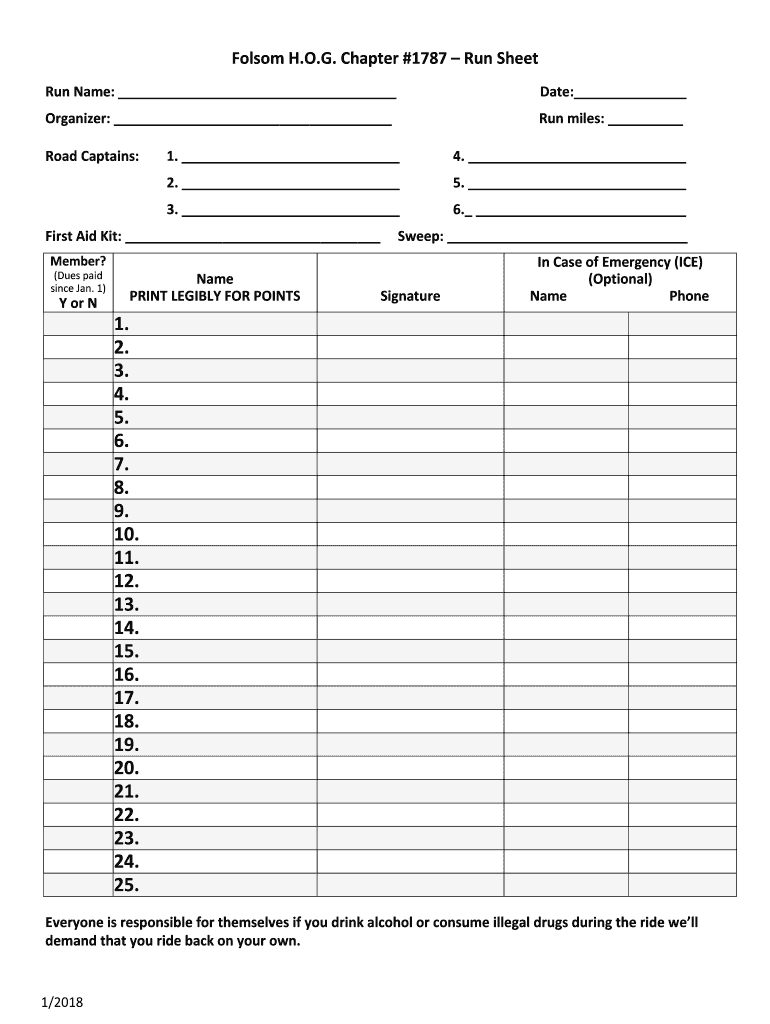 Folsom H.O.G. Chapter #1787 Run Sheet Run Name: Date: Organizer: Run miles: Road Captains:1. 4. 2. 5. 3. 6. First Aid Kit: Sweep: Member? (Dues paid since Jan. 1)Y or Name PRINT LEGIBLY FOR POINTSSignatureIn
