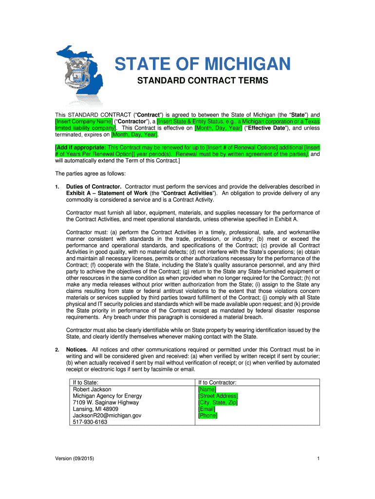 STATE OF MICHIGAN STANDARD CONTRACT Termites STANDARD CONTRACT (Contract) is agreed to between the State of Michigan (the State) and Insert Company Name (Contractor), an Insert State & Entity Status,