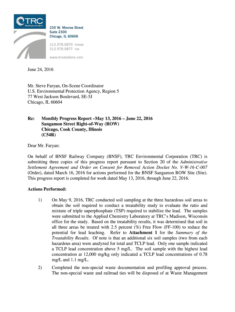 June 24, 2016Mr. Steve Aryan, Obscene Coordinator U.S. Environmental Protection Agency, Region 5 77 West Jackson Boulevard, SE5J Chicago, IL 60604Re:Monthly Progress Report May 13, 2016, June 22,