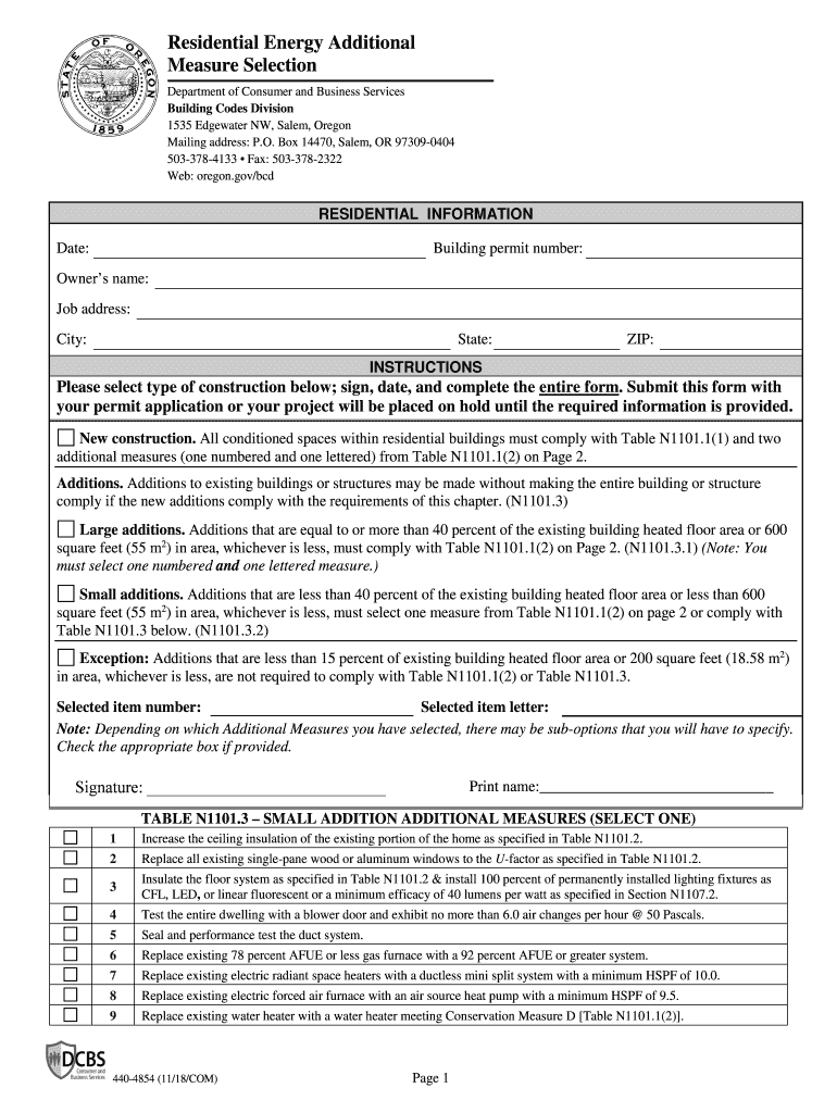 Residential Energy Additional Measure Selection Department of Consumer and Business Services Building Codes Division 1535 Edgewater NW, Salem, Oregon Mailing address: P.O. Box 14470, Salem, OR 973090404