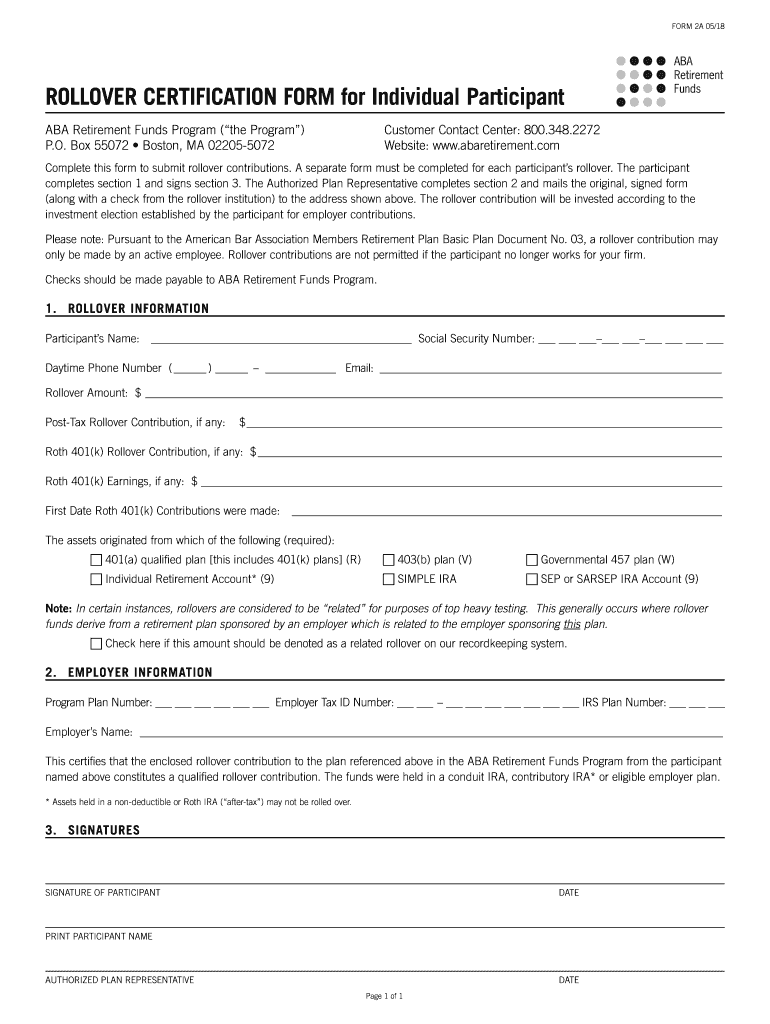FORM 2A 05/18ROLLOVER CERTIFICATION FORM for Individual Participant ABA Retirement Funds Program (the Program) P.O. Box 55072 Boston, MA 022055072Customer Contact Center: 800.348.2272 Website: www.abaretirement.comComplete